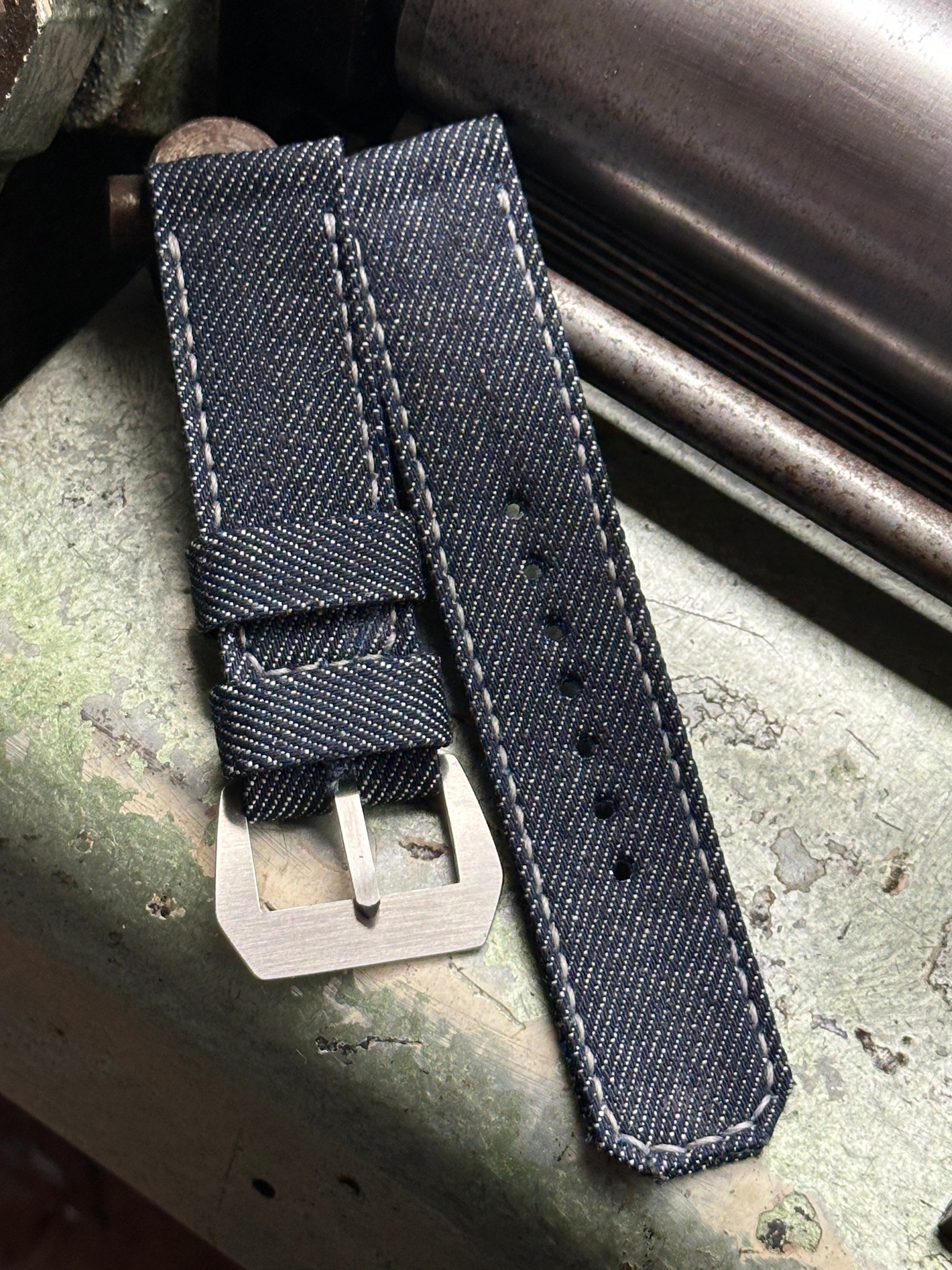 This strap made from new sustainably produced Denim strap is completely handmade and also hand stitched. Completely made from 4 layers of bonded together denim for a strap that keeps shape and is 3,2mm thick! T