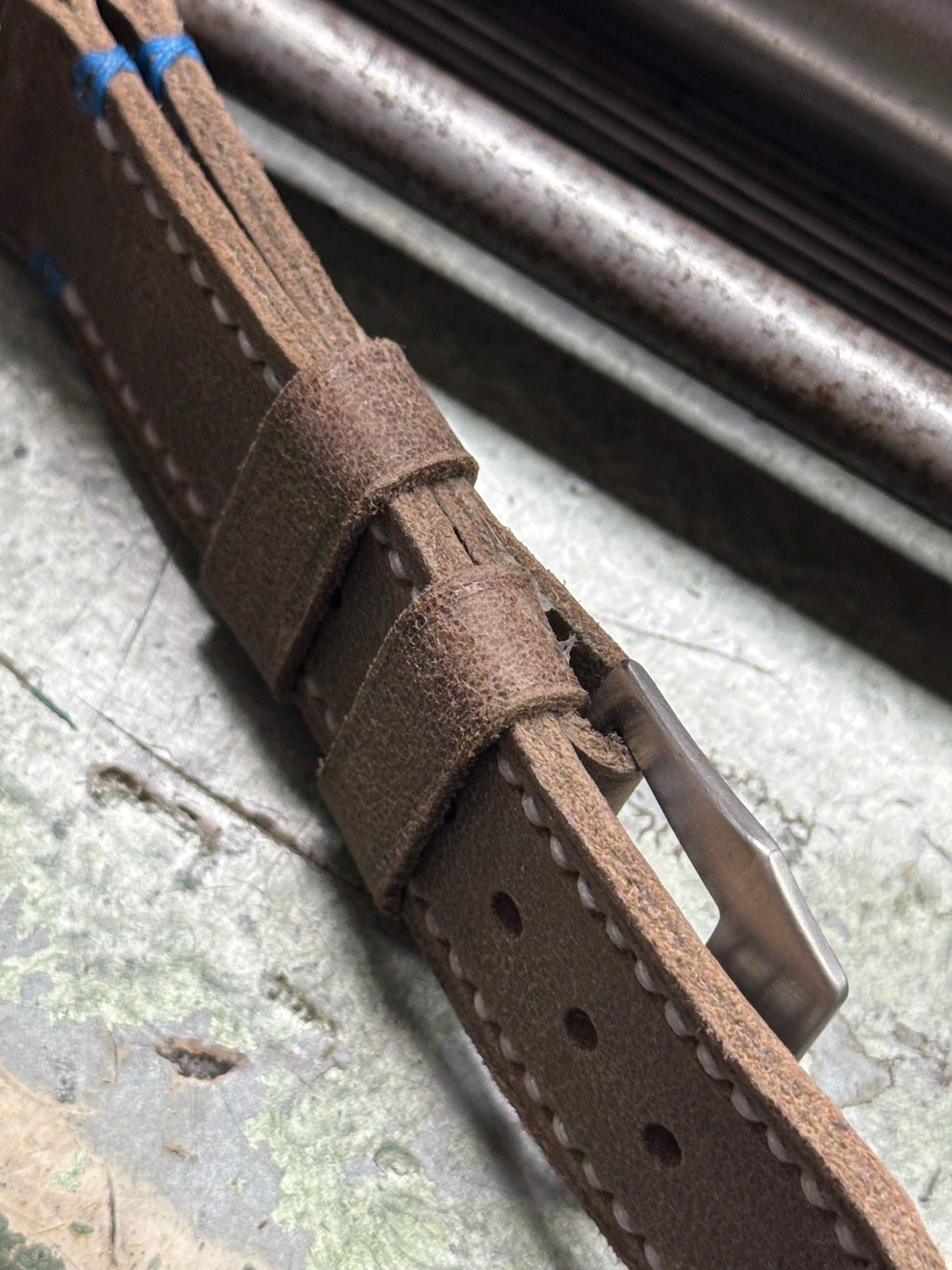 This superb aged nubuck leather strap is completely handmade and also hand stitched, from only the finest leather. Aged and a black startes patina for a vintage look.