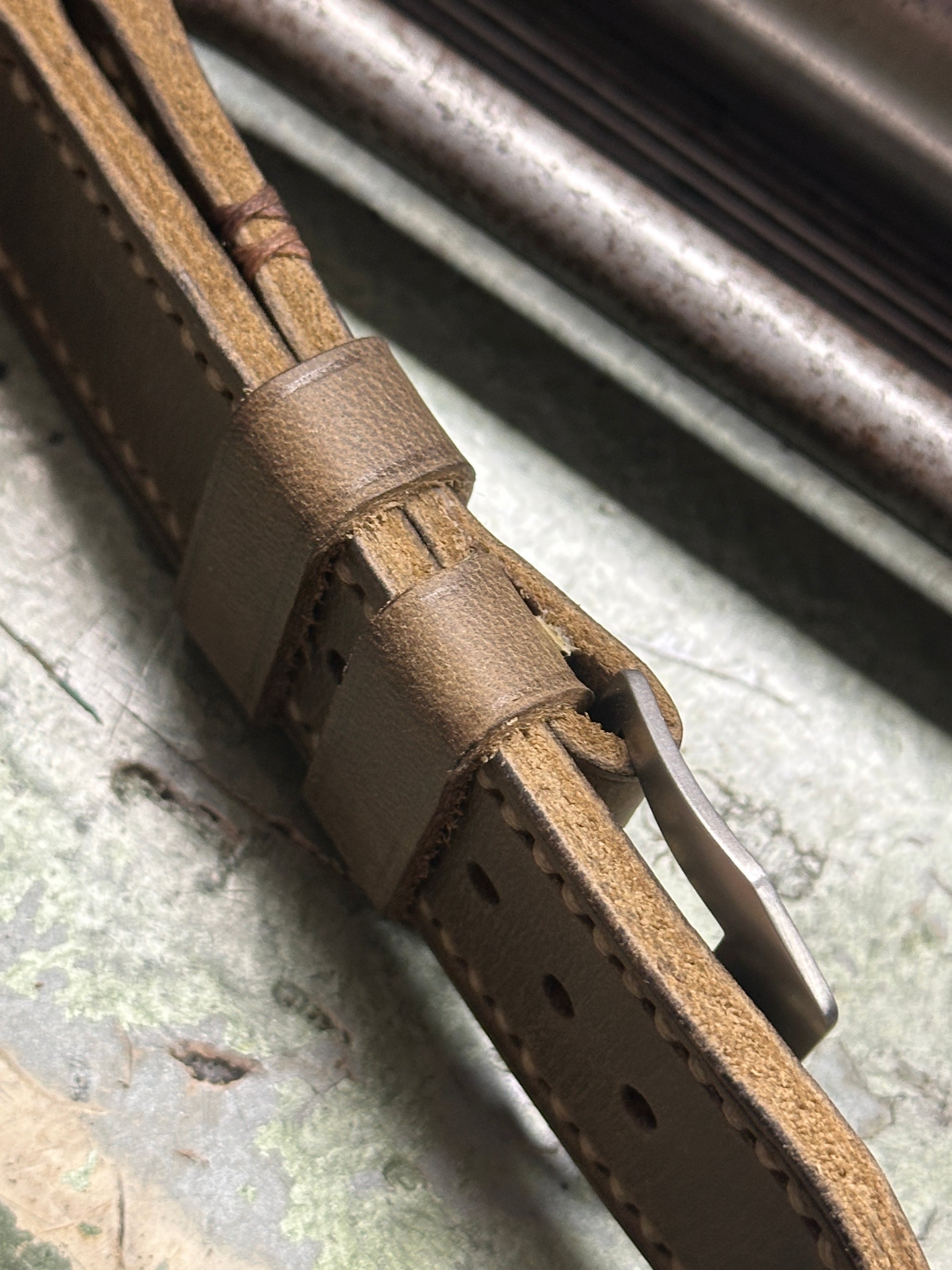 Fine structured nubuck leather which joined me on a road-trip to the Stelvio Pass in northern Italy and bordering Switserland. Subtle 2X stitch on buckle part which refer to the color of the Stelvio environment.